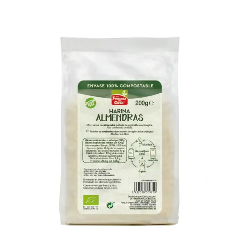 Harina de almendra procedente de cultivo ecológico, elaborada a partir de la trituración de frutos secos repelados. Ideal para preparar recetas tanto dulces como saladas. En envase sin plástico, 100% compostable.