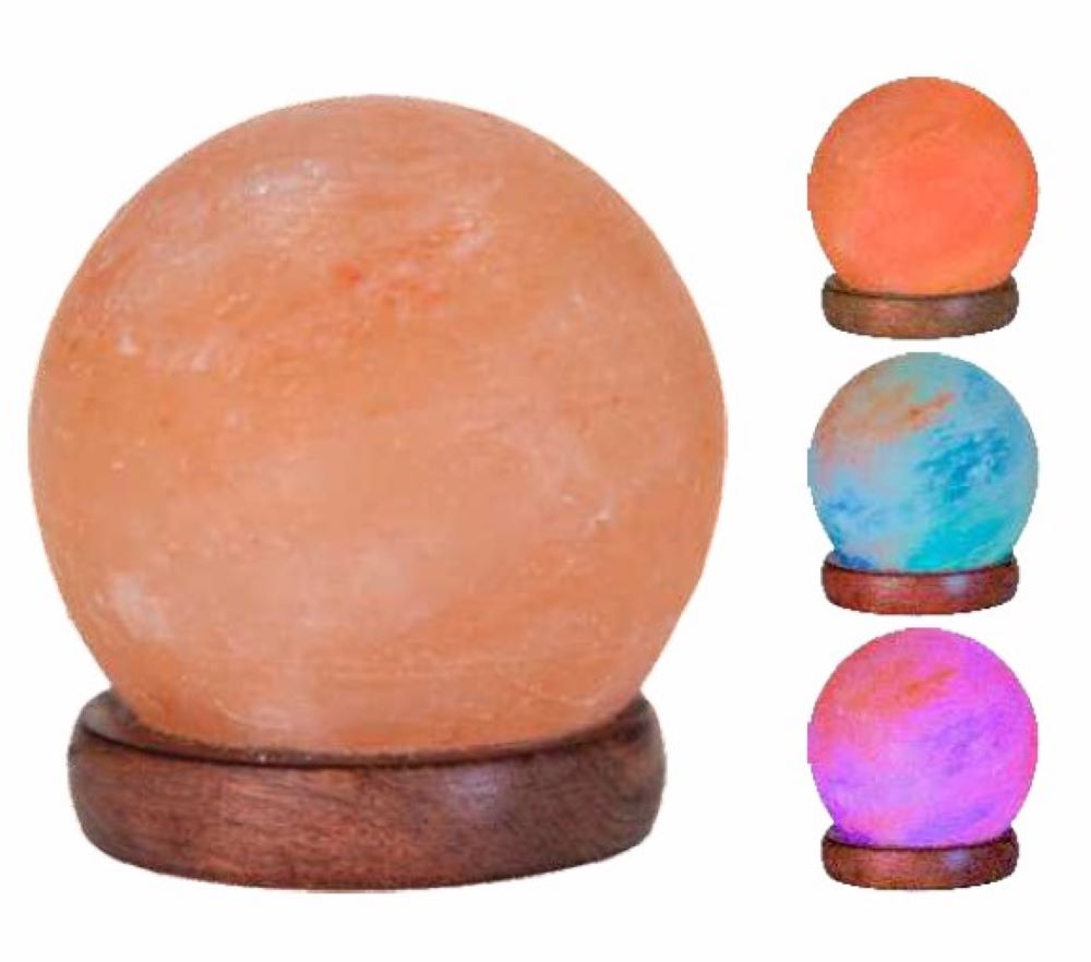 Lámpara de Mesa LED de Sal del himalaya con conexión USB, tiene una bombilla LED que cambia de color. Dispone de cable USB mediante el cual se alimenta la luminaria. Base de madera. Forma esfera.